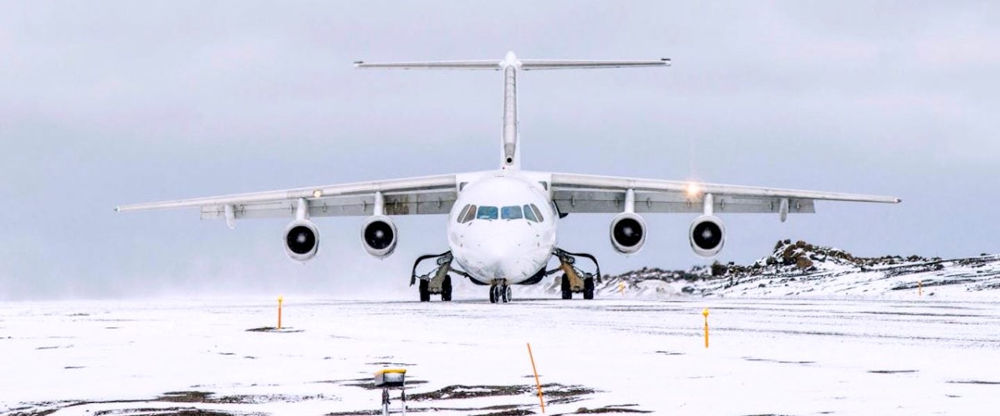 A plane lands on the runway of King George Island in Antarctica